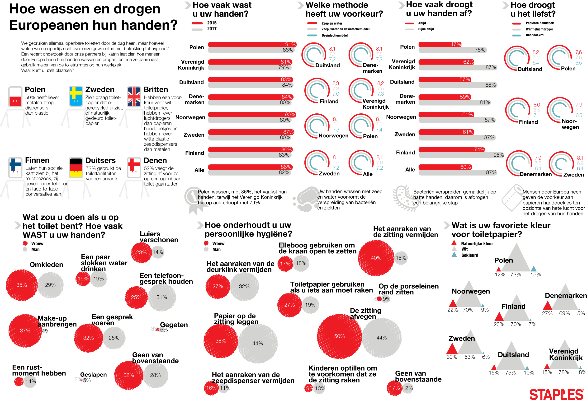 We gebruiken allemaal regelmatig openbare toiletten, de meeste daarvan bevinden zich waarschijnlijk op het werk. U denkt waarschijnlijk dat de manier waarop u het toilet gebruikt, en specifiek de manier waarop u uw handen wast en afdroogt, normaal is, maar door Europa heen doet iedereen het op een andere manier! Met de unieke gegevens van onze partner in hygiëneproducten Katrin kunt u zien hoe gewoontes door Europa heen verschillen en waar u zelf staat.